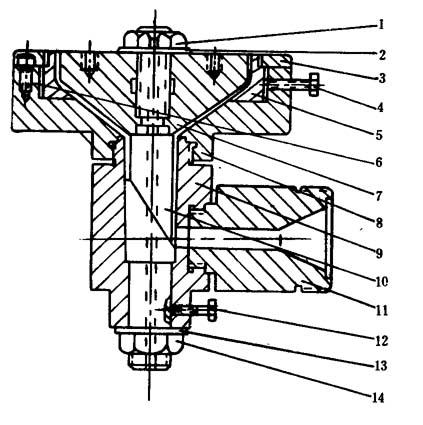 图4-4-4 侧进直角式机头 1-六角螺母 2-垫圈 3-口模压板 4-螺栓 5-口模 6-内六角螺钉 7-芯模 8-口模套 9-机头套 10-芯棒 11-联接轴 12-螺栓 13-垫圈 14-螺母 芯棒上分流处也称之为斜刀口,其形状和其对螺杆轴线的夹角,对熔体的粘度与流速影响很大。夹角一般在45~52°。芯棒上合流处的形状(也称之为斜刀口顶点),如过尖,容易造成薄膜在这点出现一条厚的条纹,而条纹两侧较薄;如圆弧较大则薄膜容易产生一条特别薄的拼缝线,并出现一滞流点,促使树脂过热分解。要解决这些问题,应根据物料特性,通过试验加以修正,才能取得满意的芯棒结构。 侧进直角式机头的经验设计参数见表4-4-4。 表4-4-4 经验设计参数