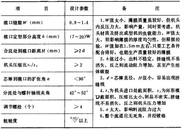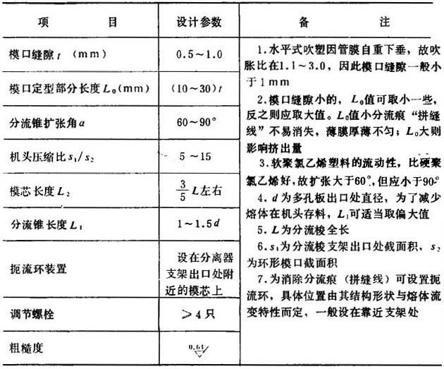 2.水平中心供料式(直通式、支架式)机头 这种机头适用水平式吹塑薄膜,如图4-4-5。其结构基本与管材挤出的直通式机头相似。熔体通过多孔板之后,经圆锥形分流梭均匀地通过模芯挤出。分流梭由支架支持(参见本章第二节),压缩空气由支架中一条“分流筋”上的小孔经模芯通入管膜。支架“分流筋”的数在强度足够的前提下应尽可能少而薄,目前一般“分流筋”的筋数为3~5根。机头的经验设计参数见表4-4-5。