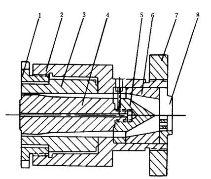 图4-4-5 水平中心供料式机头 1-压紧螺母 2-模体3-模口 4-模芯 5-分流梭 6-垫圈 7-法兰 8-滤板 表4-4-5 机头经验设计参数