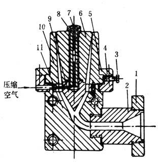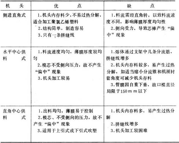 图4-4-6 直角式中心供料机头 1-法兰 2-机头联结器 3-调节螺钉 4-口模套 5-口模压模 6-芯模 7-连接杆 8-螺母 9-分流梭 10-口模 11-模体 表4-4-6 三种机头的优缺点比较