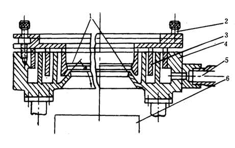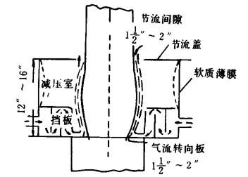 图4-4-7 风环结构示意图 1-出风口 2-调整螺钉 3-挡风板 4-风环 5-进风口 6-机头 (2)减压室冷却风环 这种风环是在上述普通风环的上部增加一个减压室如图4-4-8。在风环的空气出口处设有气流转向板,使气流沿管表面平行流动。在风环上部设有带节流间隙的简单装置。气流沿膜泡表面向上流动时可使此装置内形成减压,故称为减压室。膜泡通过此减压室时,有助于均匀地吹胀并提高冷却效果。同时,如管膜直径(即吹胀比)发生变化时,则减压室出口处膜泡周围的间隙也随之增大或减小,风机的背压也随之而异,致使减压室的减压程度就随膜泡直径增大而减小,膜泡直径减小而增大,管膜泡的吹胀比逐能自动回复原状,起到自动调节吹胀比的作用。