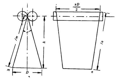 图4-4-8 减压室冷却风环示意图 (3)水环 冷却水环是内径与管膜外径相吻合的夹套,夹套内通冷却水。冷却薄膜时,薄膜由环内通过,贴着水环而被冷却,这种冷却装置主要用于聚烯烃下垂式吹塑工艺。 (4)内冷却装置 内冷却装置适用于生产线速度高,且薄膜较厚的冷却。这种装置主要在管膜内部设置圆筒状热交换器或其它能使热空气不断地交换的装置,以使薄膜能迅速冷却。这种内冷方法必须在管膜内保持恒定的压力,否则会导致管形不稳定及管径波动等问题。 2.夹板 夹板是稳定泡管形状,以使其逐渐压扁而被导入夹辊的装置,可由金属板、木板、纤维板、铜管及金属辊等材料制成。用排列的铜管或金属辊所制的辊式夹板虽具有摩擦阻力小,散热快的优点,但由于管膜内的气压作用使薄膜在金属辊之间胀出,容易使薄膜产生皱纹;用木板所制的平板式夹板,具有结构简单的优点,但摩擦阻力大,也会使薄膜产生皱纹,而且导热性差,减缓薄膜的冷却,所以采用金属板较适宜,金属板能通水冷却,则效果更好。 夹板之间的夹角α大小,将直接影响薄膜皱纹的产生。从理论上说,管膜在从圆筒状被夹板压平导入夹辊的过程中,管膜周围各点的运动距离是不同的,如图4-4-9。运动距离最长的是m点,其距离为lm;运动距离最短的可近似看成n点,其距离为/n。