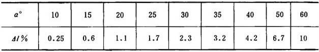 由表4-4-7可以看出,随着α角的增大,其相对差值△/越大,可见夹板的夹角越大,薄膜产生皱纹可能性也就越大,但夹角过小,则带来夹辊与口模的距离增大及薄膜与夹板的摩擦力增加的不利因素。根据经验,水平式吹塑的夹板夹角最好不大于30°,而上引式或下引式吹塑的夹板夹角则最好不大于60°。 表4-4-7 α角与△l的关系