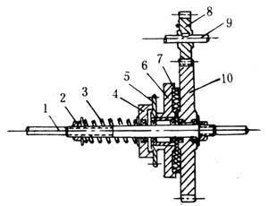 图4-4-11 摩擦离合器示意图 1-总轴 2-调节螺母 3-压力弹簧 4-压盖 5-主动链轮 6-打滑轮 7-摩擦片 8、10-齿轮 9-卷取轴 |