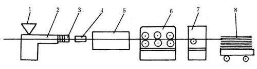 | 释义 | 设备 异型材的挤出设备,主要有挤出成型机、机头、定型冷却装置、牵引机以及其它附属装置等。异型制品的生产工艺流程见图