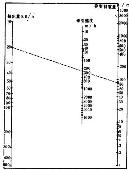 图4-6-2 异型制品生产工艺流程 1-加料斗 2-挤出成型机 3-机头 4-定型装置 5-冷却装置 6-牵引装置 7-切断装置 8-制品 (一)挤出成型机 一般生产聚氯乙烯制品用的单螺杆或双螺杆挤出成型机均可采用,由制品大小选用挤出成型机的规格。选定的方法有: ①按异型材的形状特征,参照板材及管材挤出成型用挤出成型机进行选择。 ②异型材单位长度的重量、牵引速度(一般在0.5~4.5m/min范围内,壁厚的异型材牵引速度较慢,反之可稍快)和挤出量三者之间的关系见图4-6-3。如确定了异型材单位长度的重量及挤出成型机的挤出量,则从图4-6-3就可求得所需的牵引速度。例如设定异型材的单位长度重量为85g/m;牵引速度为250m/h,则连接两者的刻度点并延长至挤出量的轴线,就得出所需挤出量为20kg/h,于是即可参照标准选择挤出成型机规格。