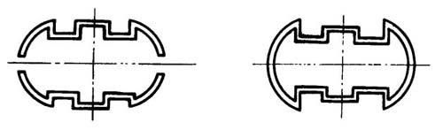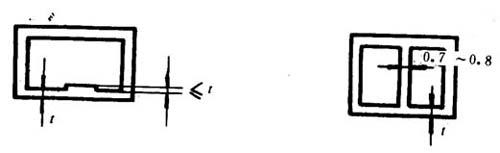 图4-6-6 内外侧隅角 ④异型截面应尽可能设计成对称形,这对壁厚不等或外侧有筋的异型截面尤为重要,以便保证产生的应力对称平衡,才不致使截面歪斜。对于一般非对称的异型截面,如有可能,可将两个或两个以上制件组合成对称形状一齐成型,而后再切开。这样,可以改善加工性能并提高质量,如图4-6-7。
