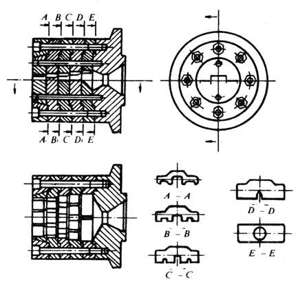 图4-6-7 装饰条切断举例 2.机头类型 按机头内熔体流道的变化,有如下两种基本结构。 ①流线型机头 其中又分阶梯式和整体式两种,分别如图4-6-8,图4-6-9所示。流线型机头流道无死点,消除了容易招致热分解的部位,所以硬聚氯乙烯异型材的挤出大多采用流线型机头。