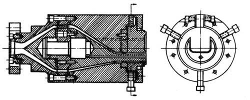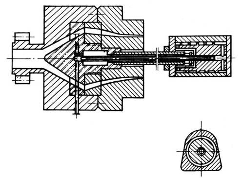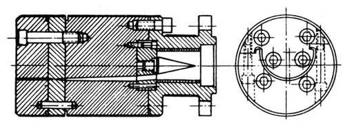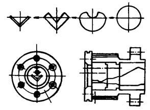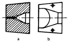 图4-6-9 整体式流线型机头 ②板型机头 板型机头见图4-6-10所示,虽有结构简单、调整安装容易等特点,但对硬质聚氯乙烯挤出的成型容易产生局部过热分解,以致影响生产周期。