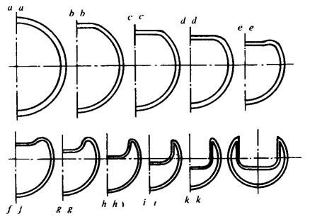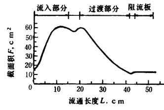 图4-6-15 流道截面变化 ②按经验方法 按上述理论方法设计的过渡部分截面,由于熔体表观粘度在流道内变化等各种因素,并不能取得最佳状态。因此通常对于过渡部分流道截面的设计和配置都根据实践经验,而后用试差法加以修正。流道的修正应逐步进行,以便绘制修正曲线(如用纵座标表示模头的变化,横座标表示截面变化)而用外插法求得修正数值。此外,修正时还可利用流动公式,例如熔体通过狭长矩形截面的流道时,如按牛顿流体的流动,其流量Q为