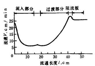 图4-6-12 熔体流速与流通长度的关系 过渡部分截面变化的设计有理论和经验两种方法。 ①按理论方法 将流道截面的任意轮廓换算成当量圆,研究当量圆半径的变化;画出过渡部分的纵截面图,连接最大截面积与最小截面积之间流道的外侧壁,纵截面的外侧壁与机头轴线应构成小于30°的角。 过渡部分流道的截面变化举例,如图4-6-13,图4- 6-14、图4-6-15所示