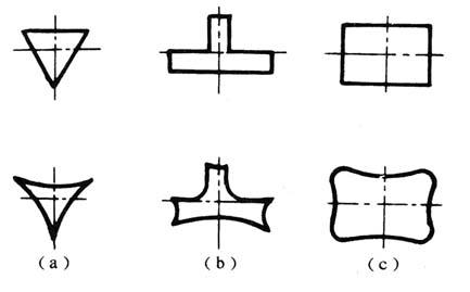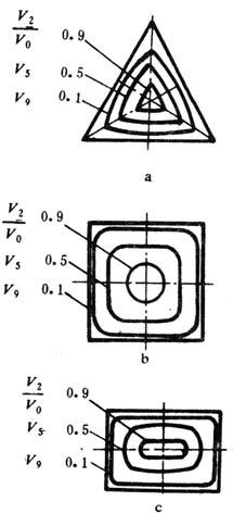 图4-6-17 各种截面速度分布 (1)截面形状修改 在图4-6-17(a)表示正三角形截面积的速度分布,如修改为图4-6-18(a)那样的截面形状,由模唇挤出的型坯在拉伸时,流出速度慢的部分由于受到比较大的拉伸而缩小,大致可以获得近似正三角形的形状。但是由于拉伸的不平行使制品内部产生变形。