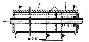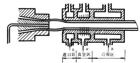 图4-6-21 加压定型套定型冷却 1-塞子 2-电磁铁芯 3-电磁磁吸 b.真空定型 真空定型套如图4-6-22所示。套的进口区只对型坯冷却。当型坯通过真空定型套真空区段时,型坯外围就处于负压,于是中空部分的大气压力就会使型坯贴在真空定型套内壁,而使其尺寸符合要求,以后的冷却区是使型坯进一步冷却的。型坯截面应比定型套入口截面稍大,这样,型坯通过时即能利用型坯本身而将真空区密封,防止泄漏。进口区段的冷却作用是使型坯具有一定的刚度,以免真空吸口被堵住。入口处要有足够大的圆滑斜面以利型坯的导入。