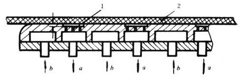 图4-6-23 整体真空室 a-接真空泵 b-接冷却水 1-真空孔 2-产品 ③浮动芯棒定型 把内部设有冷却装置的浮动芯棒固定在模芯上,见图4-6-24,使被挤出的型坯贴着芯棒表面定型冷却,即为浮动芯棒定型。由于冷却介质必须通过模芯而流入浮动芯棒,因此与模芯连接的面应进行隔热,以防模芯温度下降,导致挤出困难。