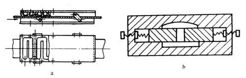 图4-6-27 伸缩式滑动定型 a-自重式 b-弹簧式 使用滑动定型时,通常定型模入口必须有一定斜度,以便型坯的导入,同时在型坯进入定型模前必须预先用水浴或其它方法使其冷却,以便型坯表面具有一定的刚度。滑动定型型坯预冷却装置见图4-6-28所示。