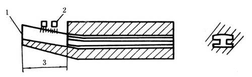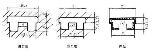 图4-6-28 滑动定型型坯预冷却 1-型坯 2-水浴 3-托板 整个定型模的宽度和长度上交错设有冷却和真空区,冷却水是强制循环的,借以加强冷却效果,免使模内某一部位产生过热而造成粘模。 (2)定型冷却模截面设计 制品离开定型冷却装置后还会收缩,为了保证异型材外形尺寸,定型模出口尺寸必须比异型制品尺寸约大1.5~20%。 定型模从入口到出口的截面应连续逐渐减少,以适应在牵引和定型时制品截面的变化,并从而使异型材能与定型模壁之间有最好的接触而取得良好的冷却定型效果。图4-6-29表示出窗帘拉条以及其所用定型模进出口的截面尺寸。