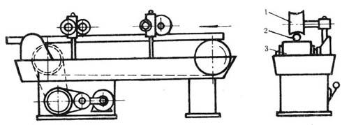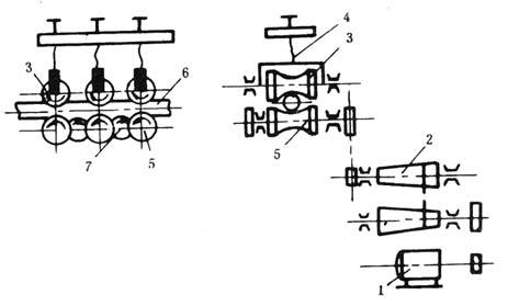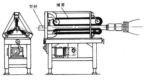 图4-6-30 滑轮式牵引机 1-电机 2-变速器 3-上牵引辊 4-丝杆 5-下主动牵引辊 6-型材7-传动辊 ②履带式牵引机 履带式牵引机一般由两条或两条以上的履带组成,见图4-6-31。此种装置的牵引力大,夹紧面积大,牵引制品的变形小。为了适应各种异型材的成型,装置中履带可以改为滑轮,参见图4--6-32。但是,履带式牵引机结构复杂,履带维修困难。