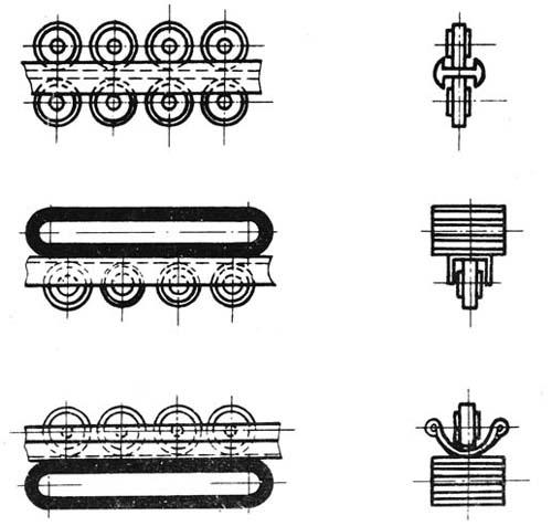 图4-6-32 履带改装方式 ③传动带式牵引机 传动带式牵引机与履带式牵引机结构相似,见图4-6-33。采用传动带(一般用橡胶作传动带)牵引时牵引力较小,但维修方便。