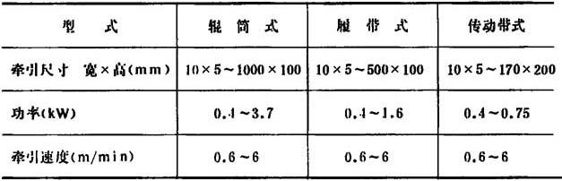 图4-6-33 传动带式牵引机 1-压辊 2-型材 3-橡胶带 ①橡胶辊式牵引机 此种装置由一对或几对橡胶辊组成,与滑轮式牵引机结构相似,牵引力较大,且适合宽度较大的板状异型制品牵引。 (3)牵引机选择 牵引机型式的选择应根据异型材形状、大小以及树脂性质等决定。下表是简单牵引机的规格,可供参考。 表4-6-2 牵引机规格