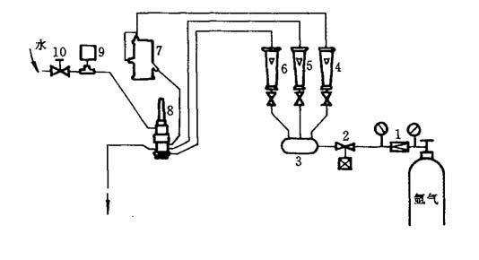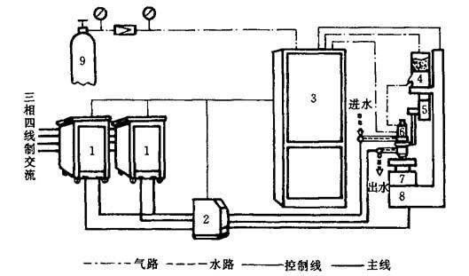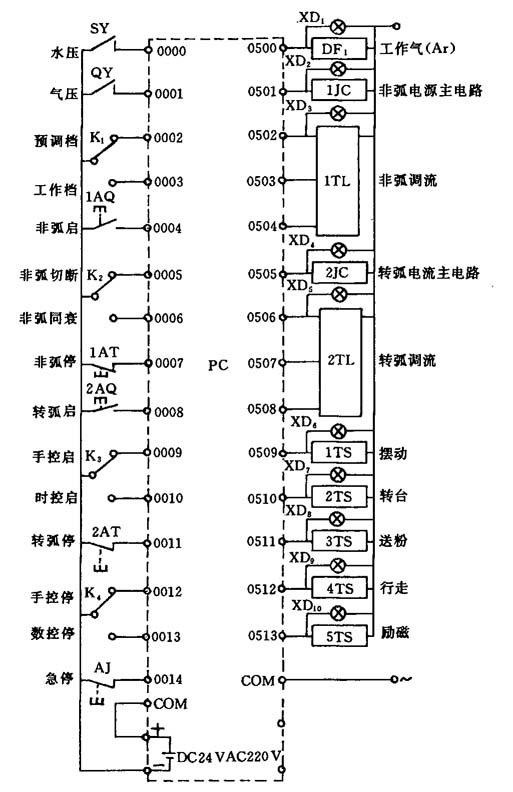 图5-43 等离子喷焊气路水路系统原理图 1—减压阀;2—电磁气阀;3—储气筒;4—送粉气流量计;5—离子气流量计;6—保护气流量计;7—送粉气;8—喷枪;9—水压或水流开关;10—阀门 等离子喷焊的工艺动作程序比喷涂复杂,因而宜采用可编程序控制器,采用PC机控制电路原理如图5-44所示.