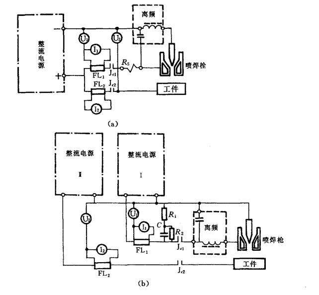 注:空载电压:≤90V;负载持续率:100%;工作周期:连续. 5.6.2.3 喷焊主电路及高频振荡器 喷焊主电路指通过电弧电流的电回路,喷焊设备有采用单电源和双电源之分,因而主电路有区别,采用单电源,非转移弧和转移弧共一台电源,主电路的基本形式如图5-41所示,该电路是通过两只接触器分别控制非转移弧回路和转移弧回路的通断,非转移弧引燃后,利用在水冷电阻上的压降而取得喷枪电极和工件之间的空载电压,以便引燃转移唬因此水冷电阻值的选定很重要,采用单电源可以省掉一个电源,使设备简化,但非转移弧电流不能调节,采用双电源,非转移弧和转移弧分别由单独的电源供电,非转移弧和转移弧都是独立的回路,因此电流可以分别单独调节,互不干扰,对于双电源主电路,对喷枪的供电可在电源直接输出侧加接触器控制,这种方式控制方便,引弧容易,但接触器容量要大;也可在电源接电网的交流侧加接触器控制,这样可减少接触器容量,在断弧期间避免电源空载损耗.