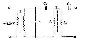 图5-41 电源主电路原理图 (a)单电源;(b)双电源. U1、U2—直流电压表;I1、I2—直流电流表;FL1、FL2—分流器;R1、R2—电阻;R6—水冷电阻;Jc1、Jc2—交流接触器触点;C—电容器喷枪的电极尖端与喷嘴之间的间隙一般有3~5mm,利用高频振荡器产生高频放电火花造成两极间的瞬间短路引燃电弧. 火花隙高频振荡器的典型电路如图5-42所示,它由高漏抗变压器B1、电感线圈L1、高压电容C1、火花放电器P及耦合变压器B2等部分组成.