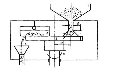图5-44 采用PC机等离子喷焊控制电路 XD1~XD10—信号指示灯;DF—电磁气阀;1JC、2JC—交流接触器;1TL、2TL—电流调节器;1TS~5TS—可控硅调速电路;SY—水压开关;QY—气压开关;K1~K4—转换开关;1AQ、2AQ—启动按钮;1AT、2AT—停止按钮;AT—急停按钮 电气控制系统中用得较多的是直流伺服电机调速电路,常用可控硅调速电路. 5.6.2.5 送粉器 等离子喷焊采用的自熔性合金粉末,固态流动性好,因而多采用刮板式送粉器,其原理如图5-45所示,当合金粉末从粉筒1的漏孔流到粉盘2上时,会在粉盘上自然堆积成近似的圆锥状,形成自然的堆积角α.α角的大小与合金粉末的固态流动性有关,当粉盘绕轴转动一圈,则在粉盘上就会堆积成一圈粉末,截面近似于等腰梯形. 送粉器的结构尺寸和合金粉末确定后,送粉量取决于粉盘的转速n,通过变速装置,可以使n在很宽的范围内连续精确地调节,于是送粉量就可以在很宽的范围内连续精确地调节,通过更换漏孔孔径d或调节漏孔端面距粉盘高度h,送粉量的调节范围将更宽.