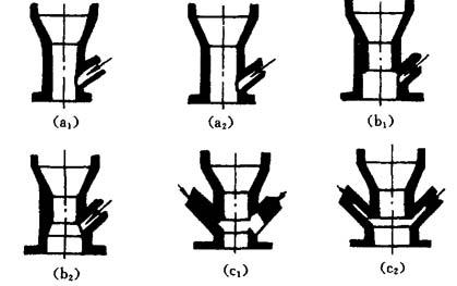 图5-46 喷焊枪喷嘴孔道形状(箭头方向为送粉孔) 电极用铈钨材料,端部为锥形,锥角略小于喷嘴的压缩角,由于喷焊时电弧电流大都在300A以下,而且使用的是氩气,因而电极烧损亦不像喷涂那样严重,这样,钨极棒可以加长,采用直冷式结构就可满足冷却要求. 喷焊枪的气流结构一般采用直流进气,采用分气环,使气流在通道内分布均匀,典型的喷焊枪结构如图5-47所示.