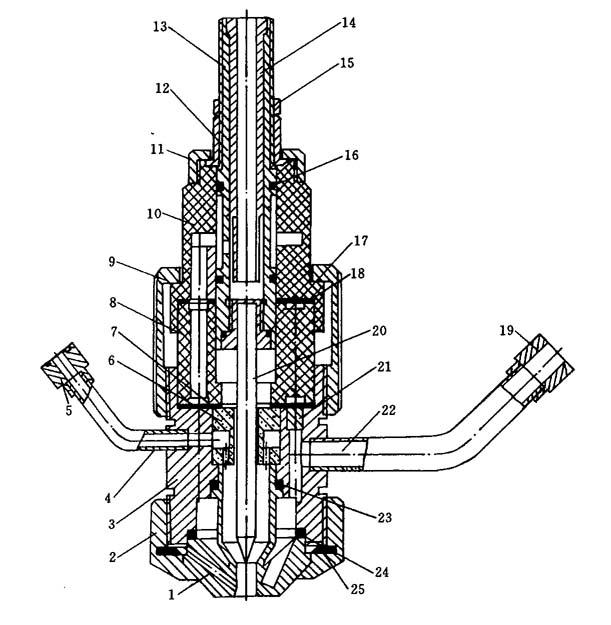 图5-47 LQ-300B型等离子喷焊枪 1—喷嘴;2—盖帽;3—下枪体;4—气(粉)管;5—气管接头;6—隔热环;7—密封圈;8—绝缘环;9—锁紧帽;10—上枪体;11—压紧螺母;12—调节螺母;13—电极杆Ⅰ;14—电极杆Ⅱ;15—并紧螺母;16、17、23、24—“O”形密封圈;18—密封圈;19—水管接头;20—电极头;21—堵水塞;22—水管;26—挡粉圈 |