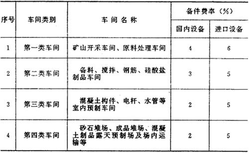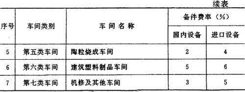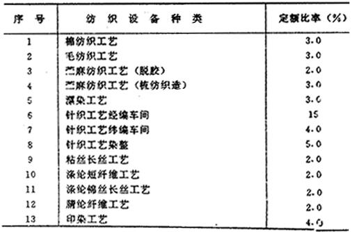 注:送电工程中有特殊大跨越者,应按单独设计的具体情况另行计算;如设备费中包括国外设备费用时(当国外设备费用内包括备品备件时)应扣除国外设备费(包括运杂费)后计算,计算备品备件时按二台机组的设备费用计算,同容最同型号的第三台及以后的机组不再计算此项费用;扩建工程计算机组时,应包括原有相同容量机组数量在内。 纺织工业部颁发的各类工艺设备的备品备件占设备原价的定额比率。见表4-32。 表4-32 纺织设备备品备件购置费定额