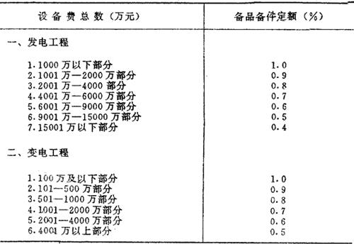 注:(1)混凝土制品室内预制车间和露天预制场设备备件费均不包括钢模备件费用; (2)生产试验室设备备件费,如有机械设备者按全部设备原价总值2%计算,如没有机械设备者不计设备备件费。 各主管部一般都规定有适用于本部范围的备品备件购置费定额。如电力部颁发的发、变电工程和送电工程备品备件购置费定额(见表4-30、表4-31)。 表4-30 发变电工程备品备件购置费定额