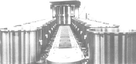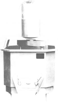 图3-5-8 立式滚揉机 优质不锈钢制的肉槽制成多边形或圆形,中间装有两个搅拌轴,轴上配有10个倾斜的桨叶,由于旋转速度较慢(3~13r/min),肉受桨叶机械能的挤压滚揉起到按摩作用,从而加快盐水吸取速度,增强蛋白质萃取力与水分的保留,改进并取得最佳的腌制效果,更密更强的滚揉能使制品出品率大幅度提高。立式滚揉机变速电机设在槽体上,通过齿轮带动桨叶轴自转,滚揉按摩好的肉从下部出料门排出。滚揉机的容量不大,大型企业一般均需同时使用多台设备,如图3-5-9所示。