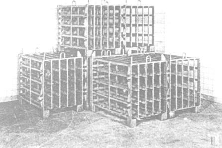 蒸煮架用不锈钢制造,根据模具尺寸一般上下分为四层,每层五排,每排前后可放3~6个肉模。工业化生产用的标准化蒸煮架可容纳105个模子。每层用托板分隔,底板和顶板均开有大孔,侧面用角钢作导轨,使肉模在加热时四面热水流通,获得均匀加热。架子顶部设有两个电动葫芦起吊用的吊环。顶上四角有定位插板,底部四角也有包角定位板,重叠放置时只要对准插板便可整齐排列。