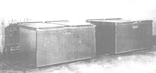 蒸煮锅配有必需的控制仪表,计有温度计、蒸汽压力表、蒸气控制阀、安全阀、电气开关按钮、指示灯、程序控制器等。图3-5-34所示为两台荷兰生产“COOLK-IN”火腿用的蒸煮锅,每台可放两个蒸煮架。照片后面位置是两套电气控制仪表屏。蒸煮锅的加温方法可采用电、油、煤气、低压蒸汽(0.05MPa以下)、高压蒸汽(0.4MPa以下)、煤炭等。