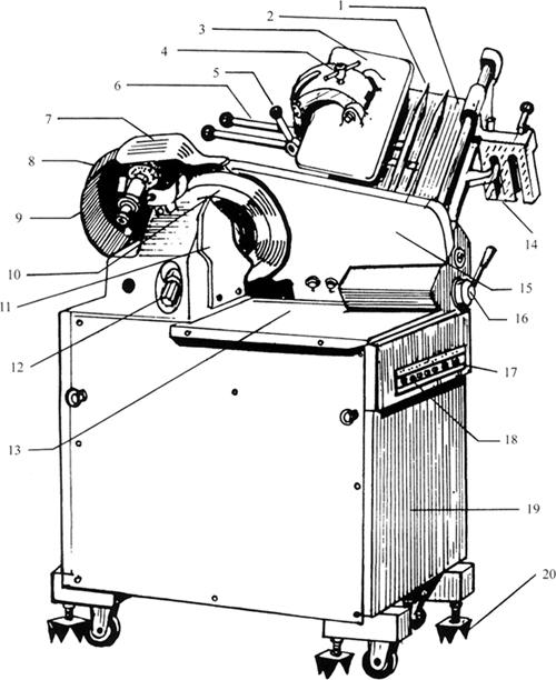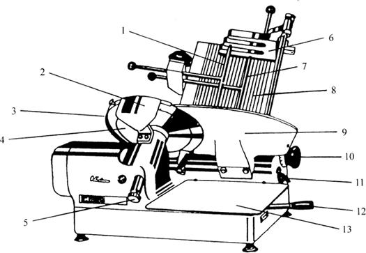图3-6-1 台式切片机 1-上部挡杆 2-砂轮安全罩 3-圆盘切刀安全罩 4-圆盘切刀 5-圆盘刀固定螺丝 6-重锤 7-横向挡杆 8-载肉台 9-厚度调节板 10-厚度调节旋钮 11-电源开关 12-离合手把 13-食品托板 台式切片机是由电动机、离合器、圆盘切刀、切刀安全罩、固定机架、厚度调节板、载肉台、横向挡杆、上部挡杆、重锤、砂轮安全罩、食品托盘、电源开关、厚度调节器和移动机构等组成。待加工肉块放入倾斜的载肉台内,用挡板轻压固定,调节好圆刀刃与调节板的距离,即决定切片厚度,规定在0~20mm范围内调节选择。当启动电机切入离合器后圆刀高速旋转,肉台左右移动,肉接触刀刃即被切割,肉片落入下部的托盘内,如此往复切片,其速度为38~46次/min,最大可切肉块直径为200mm。载肉架上的重锤压块始终压紧肉块,使肉向下移动。该设备与物料接触表面均采用不锈钢和铝镁合金制造,圆刀用硬质合金钢制造,刀刃十分锋利,表面非常光滑,符合卫生清洗要求。当电机超负荷时受保护器的作用能够自动停机。有的台式切片机具有2排2条的切片功能,每小时可切4560片。 (二)高速切片 高速切片机的结构如图3-6-2所示。其工作原理和台式切片机基本相同,不同的是速度较高,最高可达每分钟60次,切片厚度最厚可达28mm,肉块直径最大为260mm。设有手在肉架前的自动停止装置、非常事故的停止装置、反向传动机构、低电压操作回路、停电安全回路、超负荷保护装置等安全措施。并具有切割圆刀转动稳定、噪音低的特点,适用于宽400mm,高225mm范围内冷冻肉类的切片。生产能力较大。