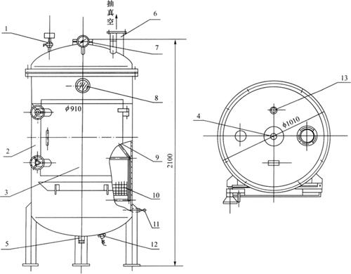 1-破真空阀 2-锅体 3-门 4-转轴 5-放油口 6-抽真空口 7-真空表 8-窥视镜 9-框架 10-网篮 11-进油口 12-电加热器 13-空气排出阀