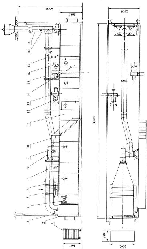 图3-6-4 直接火式自然换气干燥室 间接加热干燥设备的干燥室结构基本上与直接火式相似,不同之处在于燃烧炉产生的烟道气先加热加热器(锅炉或金属管等),室内空气被间接加热后产生对流,湿气从上部排出,虽然热效率较低,但比较干净卫生。为方便换盘,固定盘架可改为盘架小车从侧面推入。有的工厂使用蒸气热源则更为合理。 (二)热风干燥设备 热风干燥设备是一种强制循环送热风的干燥方法,设备型式较多,有强制循环干燥机(图3-6-5)、隧道式干燥设备(图3-6-6)、多层网带式干燥机等。