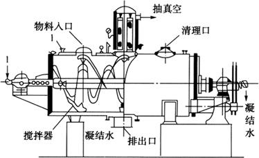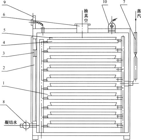 图3-6-7 真空干燥箱 1-箱体 2-门 3-窥视镜 4-加热板 5-料盘 6-排气口 7-蒸汽总管 8-汽水分离器 9-仪表板 10-照明灯 箱体用钢板制造,正面可开启大门,门上设有窥视镜,箱体设有10层中空加热平板,蒸汽通入板内,料盘放置在加热平板上,通过传热使物料升温,水分在真空状态下蒸发,从排气口由真空系统抽出。抽真空装置一般采用水力喷射泵、蒸汽喷射泵、湿式柱塞泵,由于干燥箱的蒸发量不大,故一套真空设备可同时用于几台干燥箱。使用蒸汽压力不大于0.3MPa,干燥初期压力开大,干燥后期压力要小,以防物料引起变化。蒸汽通过汽水分离器排出凝结水,仪表板上设有真空表、压力表、温度计等装置。料盘用不锈钢盘或其它金属材料制造,但盘内表面应涂聚四氟乙烯膜,防止物料粘盘不易脱落。这种设备适用于肉汁浓缩后的干燥,肉胶干燥以及肉片的干燥,对大块肉制品不适用。 搅拌式真空干燥机如图3-6-8所示。