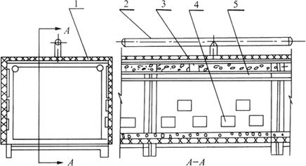 图3-6-11 连续吊轨式远红外线干燥机隧道结构 1-石棉板 2-排气管 3-循环管 4-远红外辐射板 5-物料吊轨 远红外线干燥设备属非标设备,需要根据工艺对制品的要求进行设计制造。 |