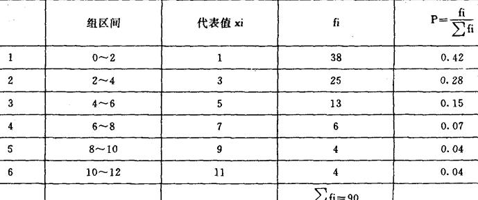 从以上数据中可以看出,在这90种备件中,各种备件更换的频数是大不一样的,最少的为零次,最多的为11次。这反映出机床在使用过程中,各种零件的作用、精度要求、工作状态不同,其失效情况也不同。为了更好地看出这90种备件在一个大修周期内使用的总体情况,可将这些杂乱无章的数据进行归纳整理,作出零件更换频数分布表(表2)。 表2 零件更换频数分布表