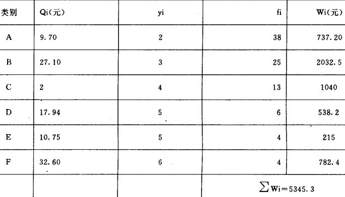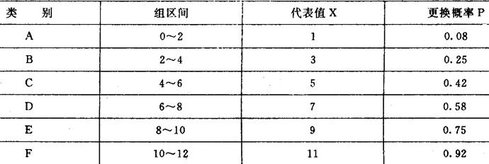式中:X(A)——A类零件更换次数代表值 N——修理设备的台数 例如,第A类零件更换次数代表值X(A)=1(见表3),统计修理设备台数N=12,则A类零件在一次设备修理中的更换概率可近似为: P(A)=1/12≈0.08 于是可得到各类备件的更换概率,列于表3: 表3 备件分类及其更换概率