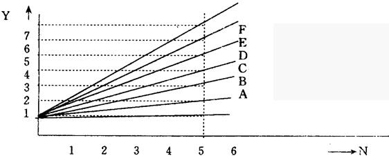 二、依据概率特征,建立储备模型 假定备件储备周期为一年。设一年内对该设备的修理计划台数为N,则各类备件的年度储备量可由下式求出: Yi=a0+PiN 其中: Yi——第i类备件年度储备量; Pi——第i类备件更换概率; N——年度计划修理台数; a0——储备基数。 给出a0是为了消除零位,或规定一个最低储备数,以减少风险率。一般情况下,可取a0=1。 上式给出的是一个备件储备量的线性模型,表明了各类备件储备量与修理计划台数之间的数量关系。显然,储备量Yi为计划台数N的函数,Pi可理解为各类备件的更换系数,当N值一定时,就可以确定各类备件的储备量。 例如,对A类零件,P(A)=0.08,当N=5时: Y(A)=1+0.08×5=1.4→2 如N取不同的值,就可以绘制出各类零件的存储图线(图2)。