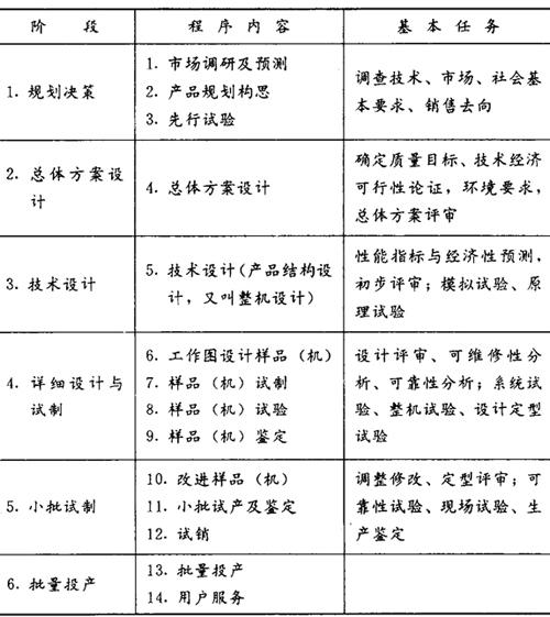 指对产品设计工作步骤、顺序和内容的规定。我国一般企业规定产品设计有6个阶段,14个程序。具体如下表所示。