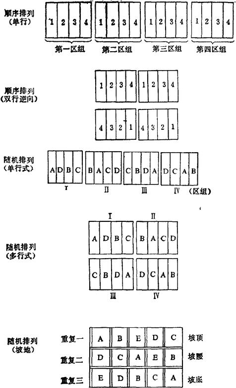 3.小区排列 比较简单的排列方式有顺序排列和随机排列,见图6。顺序排列便于在田间直接观察,便于工作,不易搞错,但会受邻近小区产生固定干扰,或因地力有固定方向的变化时增大试验误差;随机排列可减少顺序排列造成的误差,但工作要特别细心,防止弄错。无论采用什么方式排列,都必须使同一重复的区组内,小区排列应在试验条件比较一致的地块上。这种用区组来控制和减少试验误差的方法,叫做局部控制。如在坡地进行田间试验,设置重复三次时,就可以将试验地分为坡顶、坡腰、坡底三个区组,每个区组设置一个重复(图6)。