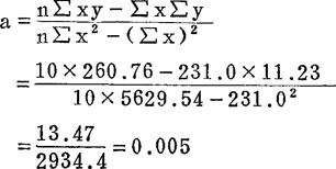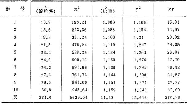 式中:n——测定的次数; x——物质的含量或浓度(即变数),为横坐标; y——测得的参数(即因变数),为纵坐标。 则回归后的直线方程为:y=ax+b 也可以由上二式中任一式求得a或b后,代入y=ax+b方程式,然后求出b或a来。 例:马铃薯块茎中淀粉含量(以x代表)和其比重(以y代表)的测定结果如下表: