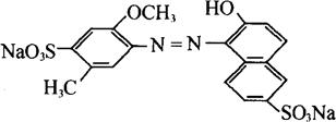 C18H14N2Na2O8S2 相对分子质量 496.43 性状 深红色均匀粉末,无臭。溶于水,呈微带黄色的红色溶液。可溶于甘油与丙二醇,微溶于乙醇,不溶于油脂。耐光、耐热性强,耐碱及耐氧化还原性差。 制法 2-甲基-4-氨基-5-甲氧基苯磺酸重氮化后与2-萘酚-6-磺酸钠偶合。 质量标准