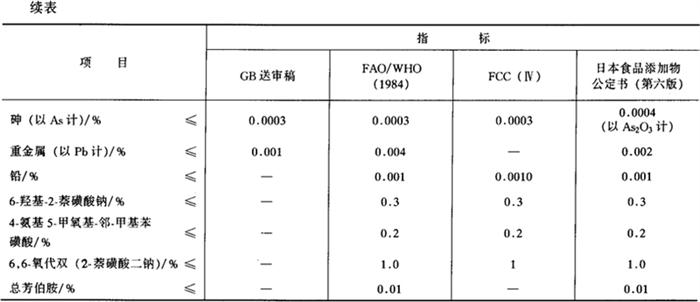*6-羟基-5-[(2-甲氧基-5-甲基-4-磺苯基)偶氮]-8-(2-甲氧基-5-甲基-4-磺苯氧基)-2-萘磺酸二钠。 鉴别方法 (1)0.1g本品溶于100mL水中,呈微带黄光的红色澄清溶液。 (2)本品微溶于乙醇,不溶于油脂,具有酸性染料的特性,能使动物纤维着色。 (3)100mL含有0.001g本品的0.02mol/L乙酸铵溶液,具有最大吸收的波长为499±2nm。 (4)取本品水溶液做纸上层析,其主色点的Rf值应与标准样品相同。 纸上层析条件: 展开剂 正丁醇∶无水乙醇∶氨水(1%)=6∶2∶3 温度 20~25℃ 试液浓度 0.1g/100mL 试液用量 0.002mL 展开剂前沿上升限度 150mm 毒理学依据 1.LD50 小鼠口服10g/kg(bw)(FAO/WHO,1985) 2.ADI 0~7mg/kg(bw)(FAO/WHO,1994) 使用 着色剂。 1.使用注意事项 参见苋菜红。 2.使用范围及使用量 我国《食品添加剂使用卫生标准》(GB2760-1996)规定:可用于糖果包衣,最大使用量0.085g/kg;用于冰淇淋、雪糕、苹果干、燕麦片(调香、调色载体)、可可玉米片(即食早餐谷类食品)为0.07g/kg;用于炸鸡调料为0.04g/kg;用于冰棍、糖果、糕点彩装、红绿丝、染色樱桃罐头、红肠肠衣、果汁饮料、果汁酒(色淀除外),最大用量0.05g/kg;用于果汁(味)型饮料、碳酸饮料,最大用量0.1g/kg;用于固体饮料,0.6g/kg;用于果冻粉、固体饮料,0.025g/kg(按稀释6倍计)。 |