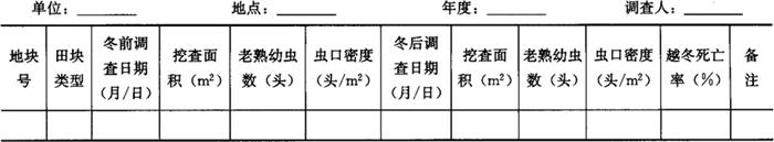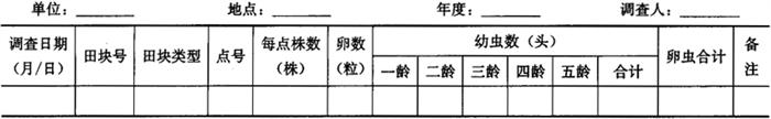 2.4 卵、幼虫量普查 在成虫产卵盛期和幼虫为害盛期各查3次。卵量普查可在卵始盛期开始,以后每5天查1次。幼虫普查分别于一龄、三龄、五龄盛期各查一次,时间可用历期法推算。每次普查6~10块田,每田查5点,随机取样,每点查10~20株,幼虫分龄。将调查结果记入豆天蛾田间卵和幼虫调查表(表4-153)。 表4-153 豆天蛾田间卵和幼虫调查表