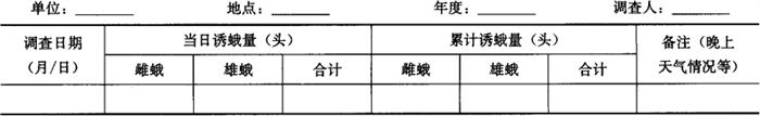 2.2 成虫调查 每年从4月至10月底止,用黑光灯诱蛾,逐日分出雌、雄蛾。结果记入豆天蛾黑光灯诱蛾记载表(表4-151)。 表4-151 豆天蛾黑光灯诱蛾记载表