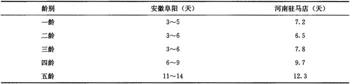 3 预测预报方法 3.1 发生量预测 根据虫量基数、气候条件、品种等因素综合分析预测。一般冬前、冬后虫口基数高,黑光灯诱蛾量多,发生期间降水量适中、分布均匀,播期早、早熟和茎秆柔软品种面积大,则虫害重。 也可采用数理统计预报法预测发生量。如河北省7月底前诱蛾量(X)同田间百株幼虫量(Y)的回归预测式为:Y=-2.089+0.072X±10.25。 3.2 发生期和防治适期预测 各地可根据多年观察资料,用黑光灯诱蛾高峰日向后推测三龄幼虫盛期(防治适期)。一般成虫高峰日向后推迟15天左右即为三龄幼虫盛期。也可根据田间卵量情况,推算三龄幼虫盛期,卵盛期至三龄幼虫盛期为8~13天。 4 测报调查参考资料 4.1 豆天蛾幼虫各龄历期